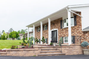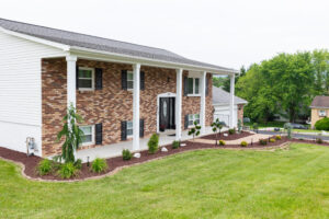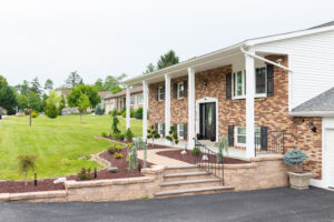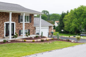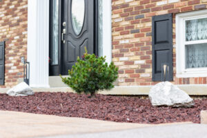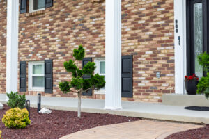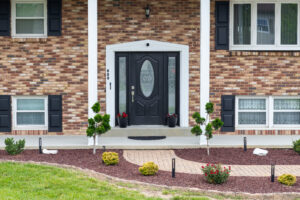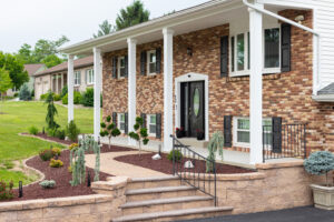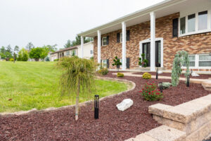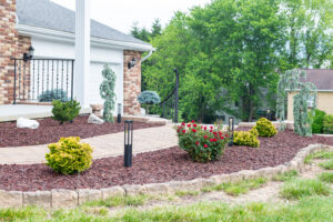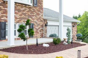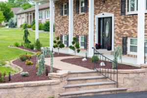 The imposing two-story porch and columns at the front of the the Winters' home demanded a landscape that projected the same class and atmosphere. Paired focal points flank both the stairs from the driveway and the front door, while a large weeping tree anchors the left-hand end of the home. The overall design invokes style and class a guest feels long before reaching the front door.