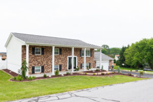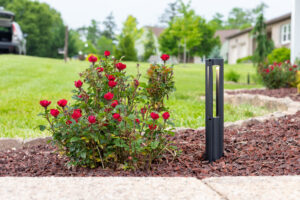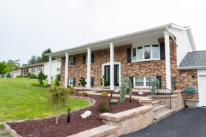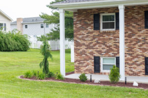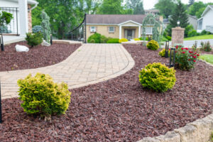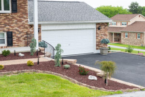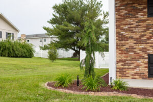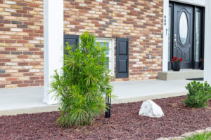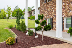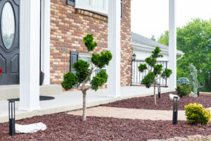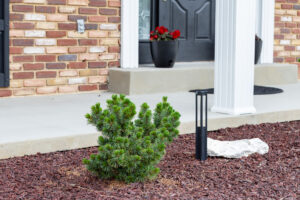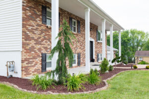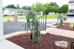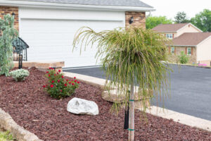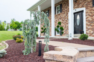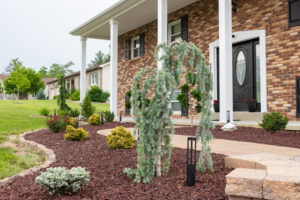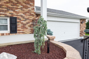 • An imposing Green Arrow Weeping Alaskan Cedar at the left corner of the house